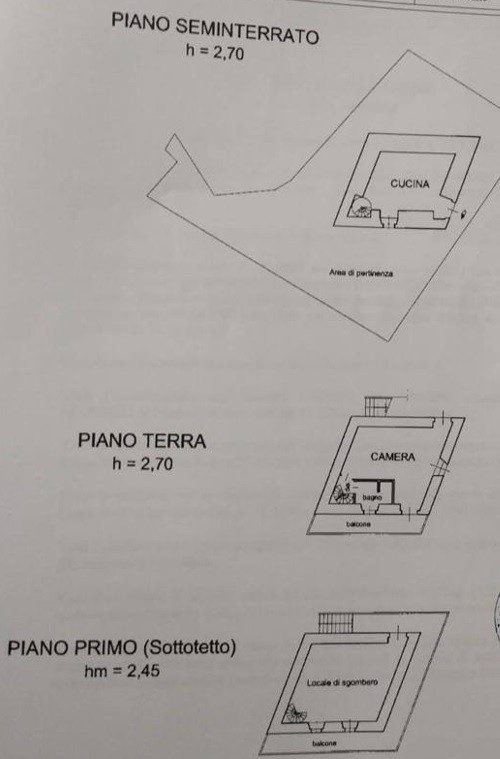 a piano terra troviamo la camera con bagno e disimpegno , a piano seminterrato la cucina ed infine a piano primo locale di sgombero (sottotetto).